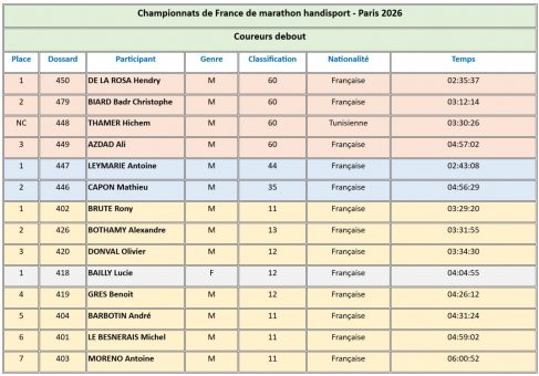 | Ho | Marathon debout | 46 | M | 3h08’45 | M | JOFFRIN | Rodolphe |