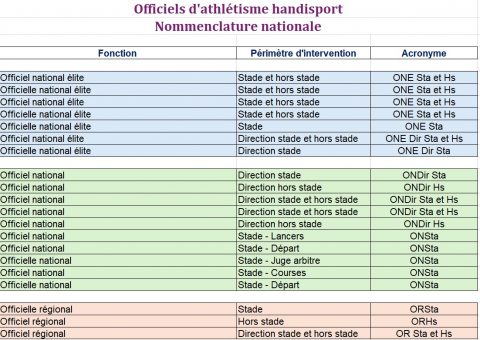Nomenclature du niveau de reconnaissance des officiels d’athlétisme handisport de la Fédération Française Handisport :