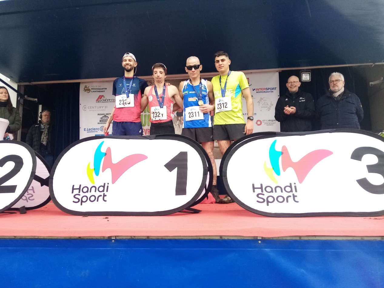 Au milieu des demi-finales de la Ligue Centre et Val-de-Loire des championnats de France de cross FFA, organisées à Romorantin, où les athlètes Handisport ont été très bien accueillis par l’organisation et chaleureusement applaudis par les coureurs valides et le public, ces France de cross FFH ont vu la victoire de Thomas Grimonprez (UPSILON-Châtenay-Malabry/T60) qui est joliment revenu, dans les 500 derniers mètres, sur Redouane Hennouni-Bouzidi (Amiens UC Handisport/T38), qui a secoué le peloton dès le début des 4265m de course, Michel Munsch (ASSA Athle Spots Sarreguemines/T11) et son guide Tom Genty ont, pour leur part, pris la troisième place et ainsi complétés le podium.